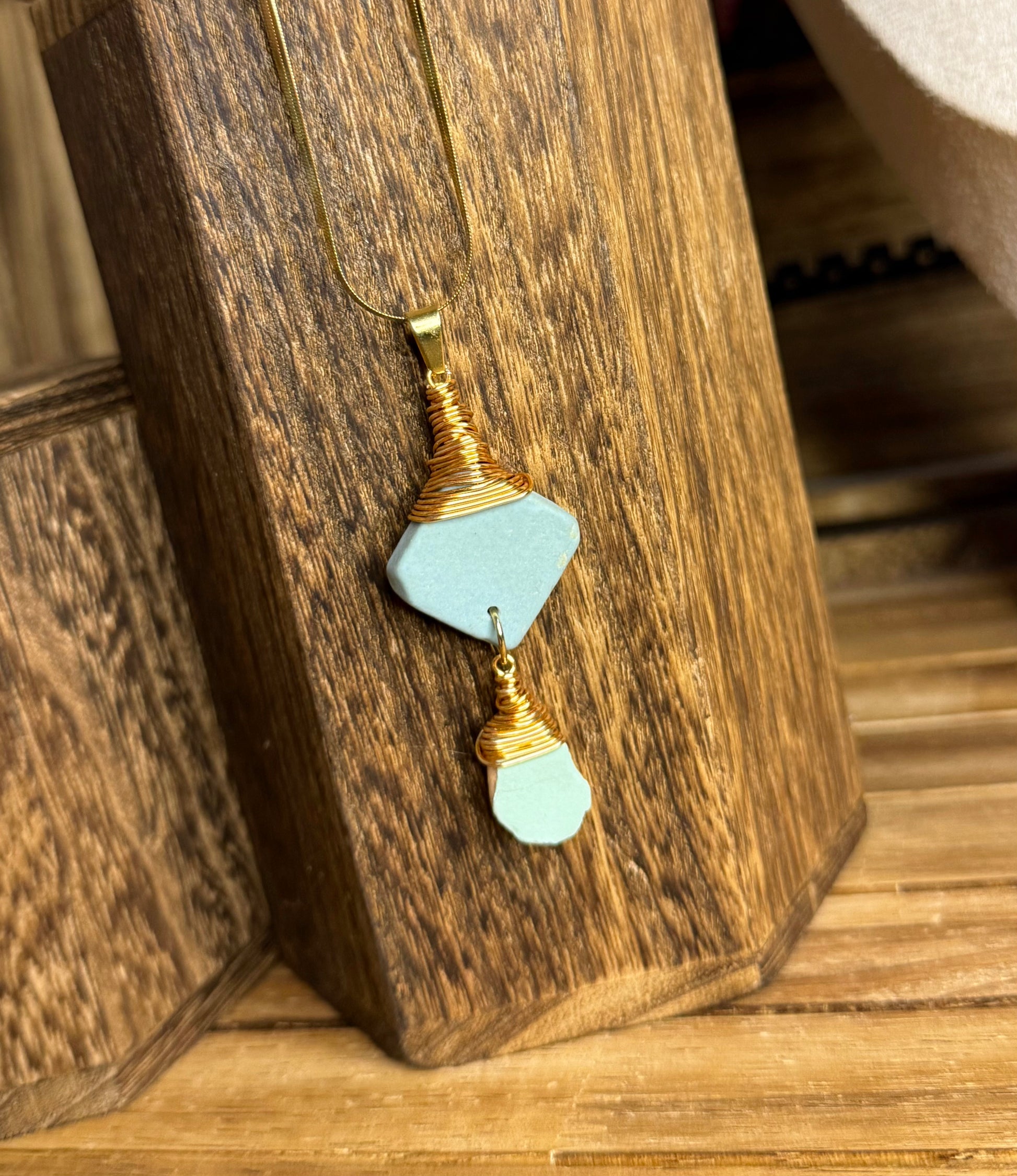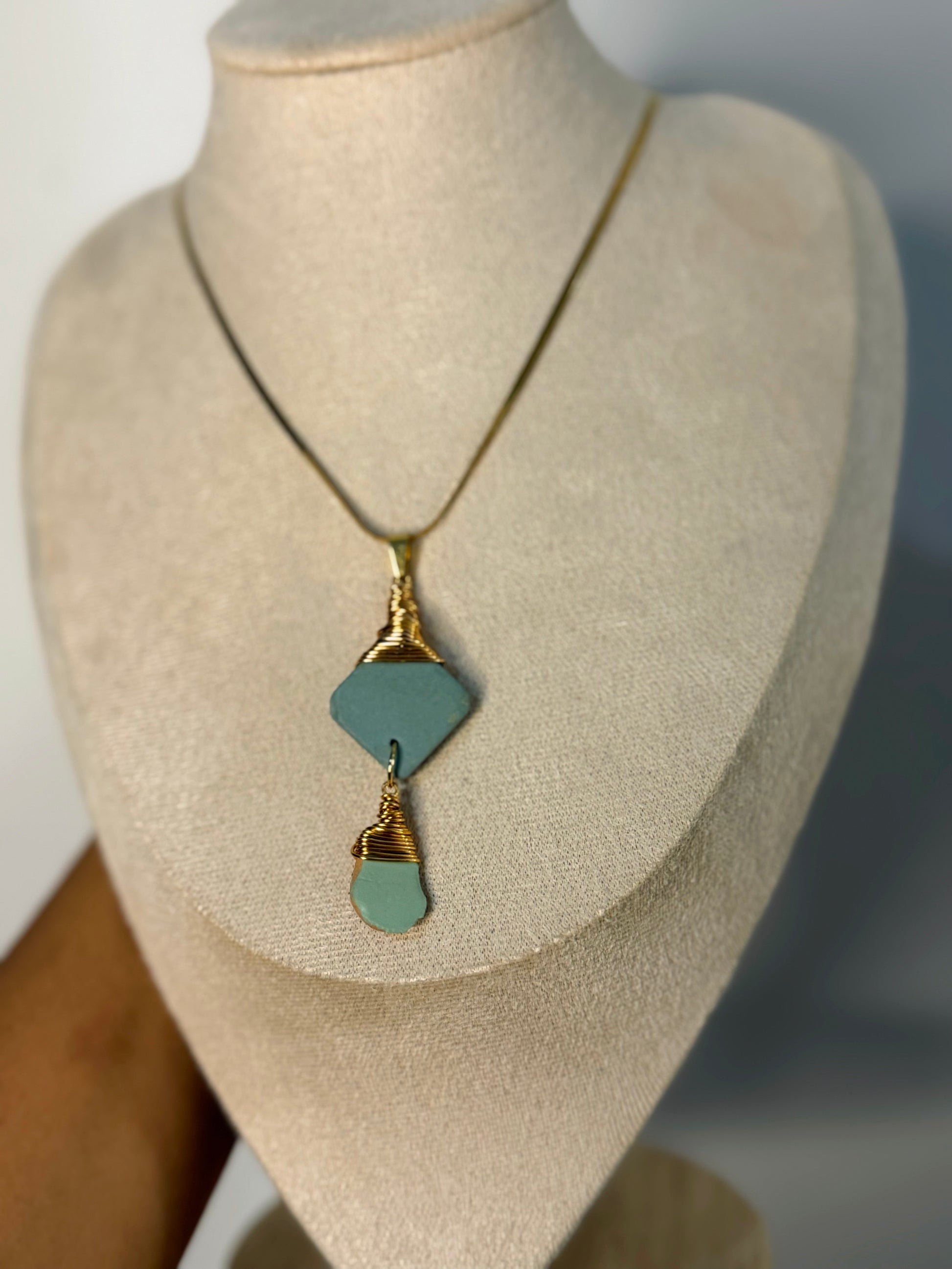 Pieza artesanal trabaja con losa de mar recolectada en Puerto Rico, alambrada a mano con alambre de acero Inoxidable, cadena con enchape de oro “18