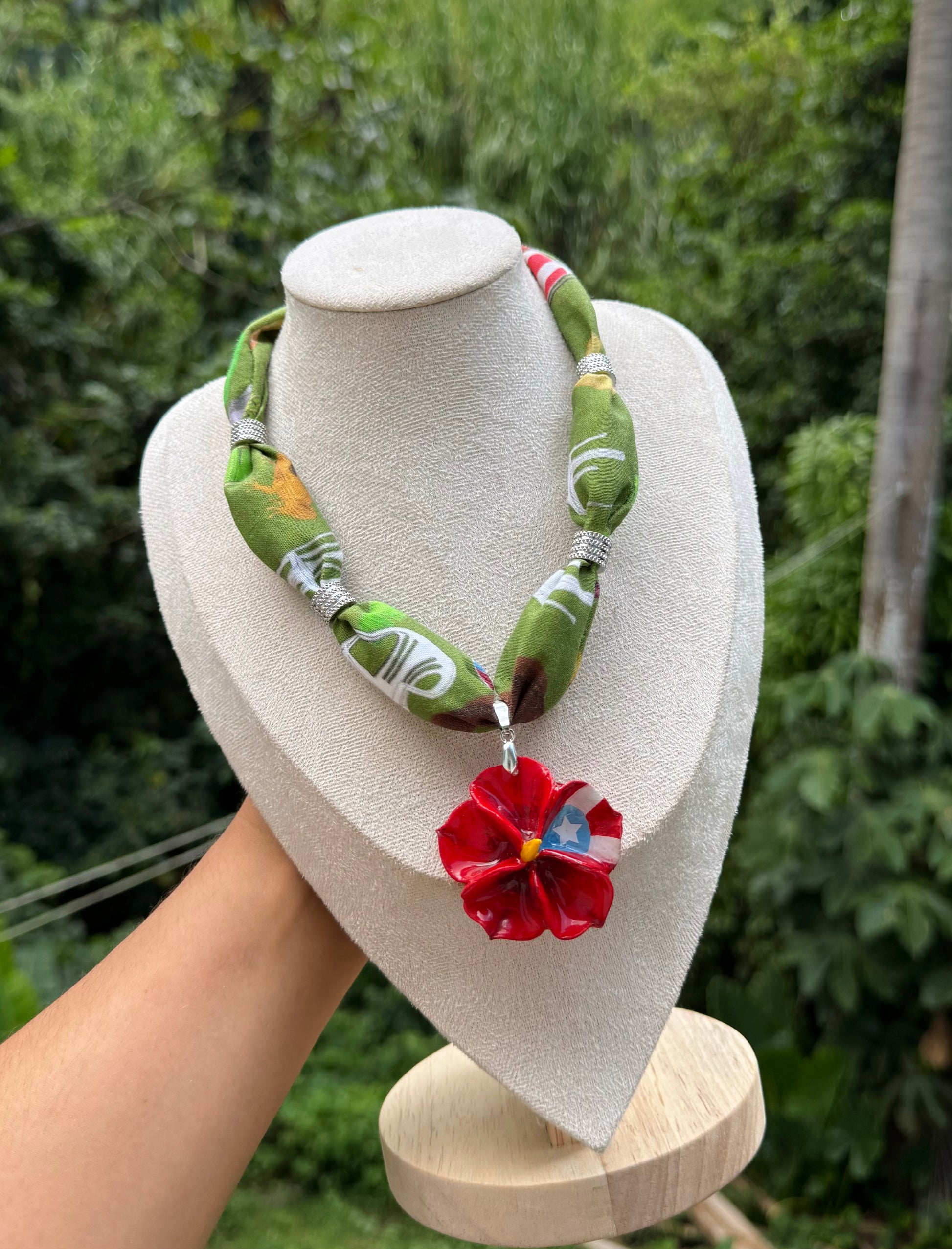 Collar de tela con diseño puerto rico, dije creado con porcelana fría, pintado a mano, charms de acero inoxidable, cierre alambrado a mano