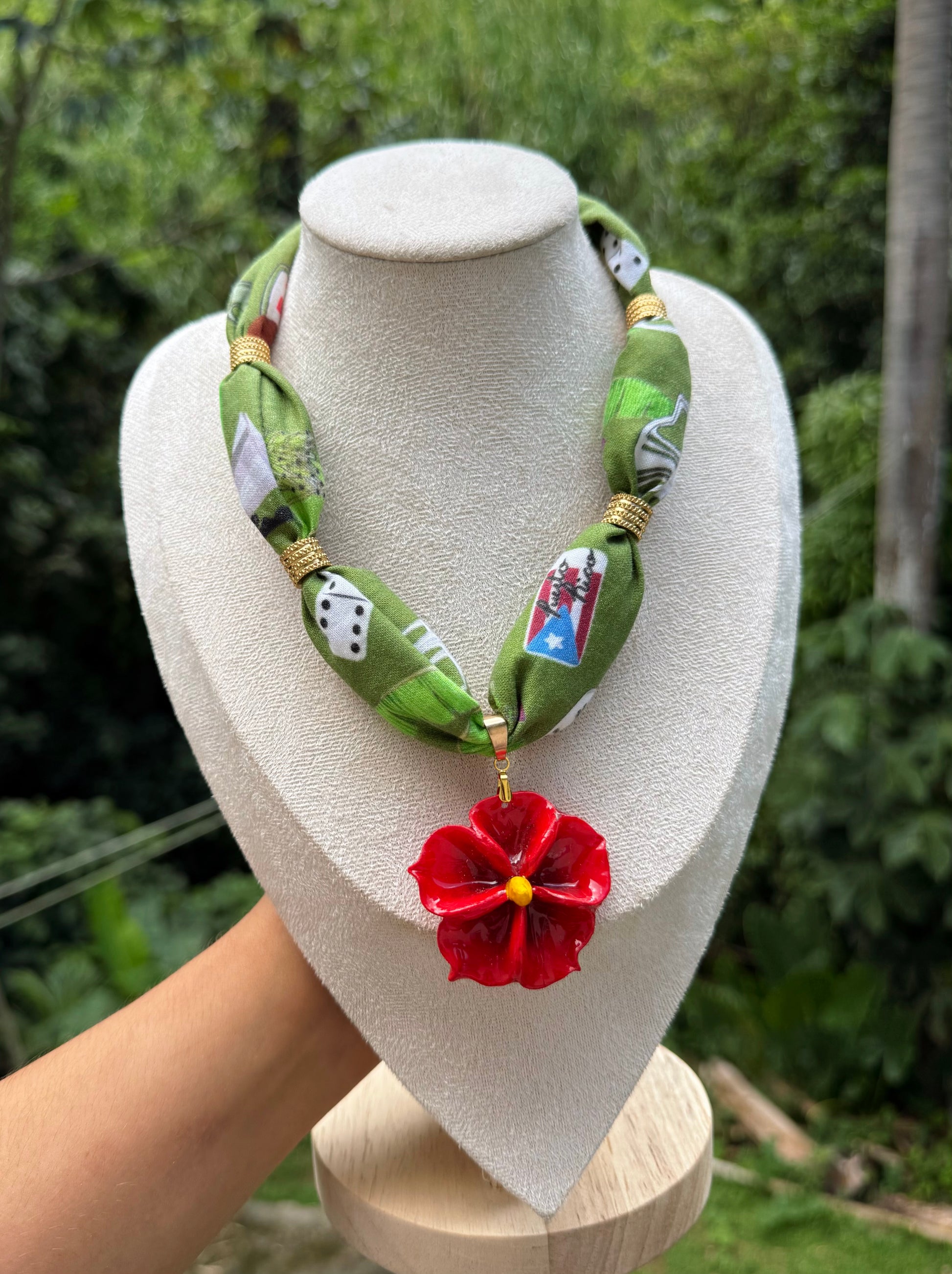 Collar de tela con diseño de puerto rico , dije creado con porcelana fria pintada a mano, charms de acero inoxidable, cierre alambrado a mano