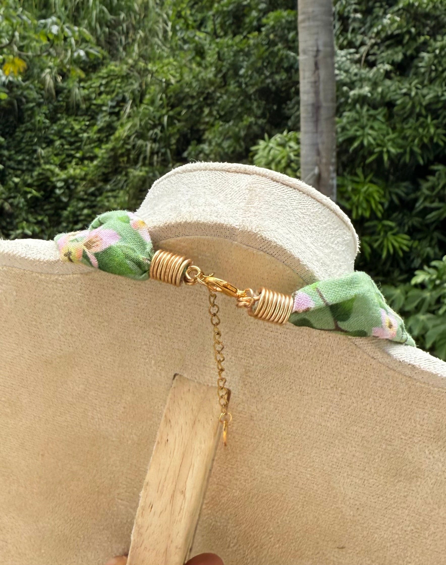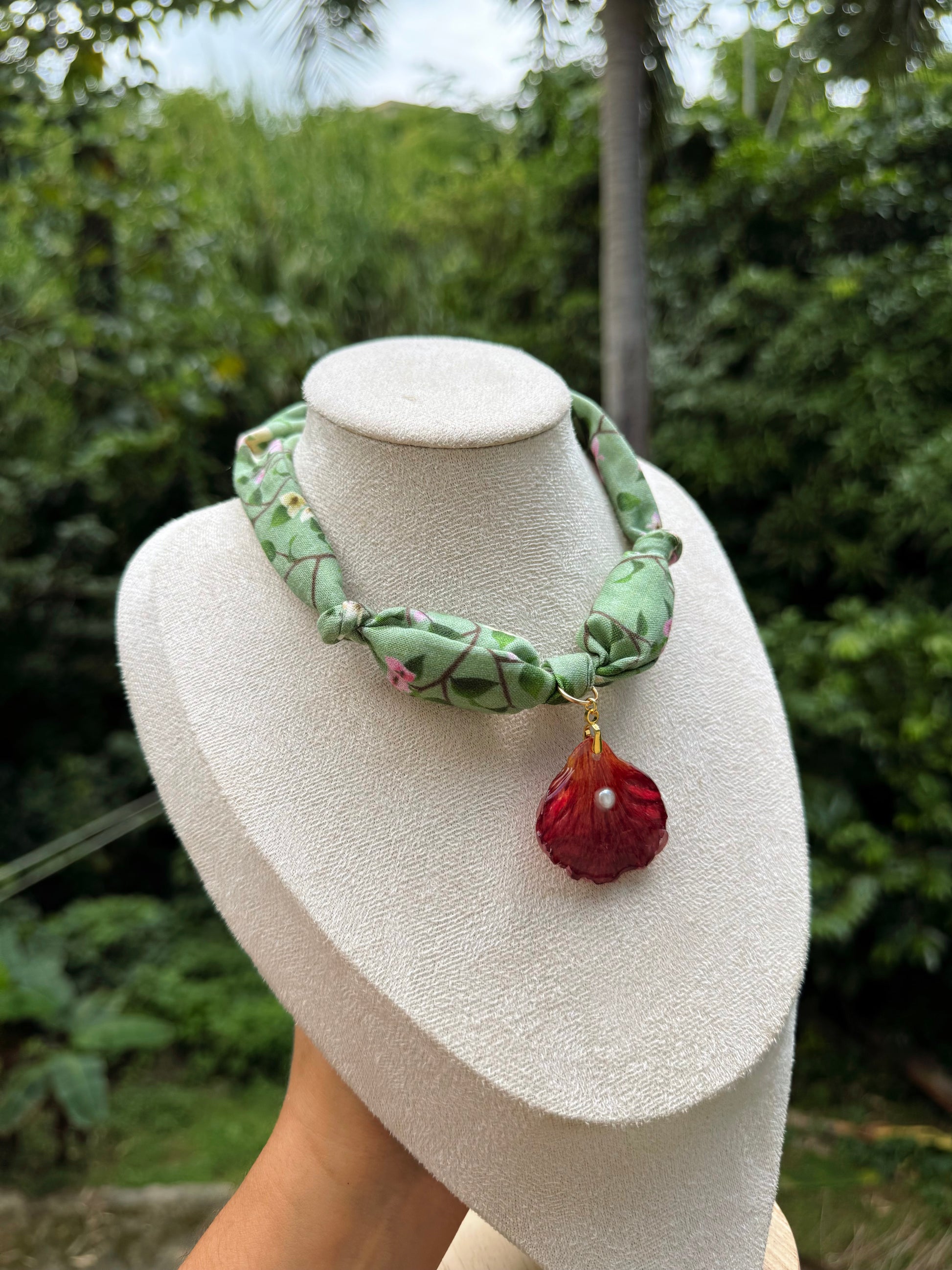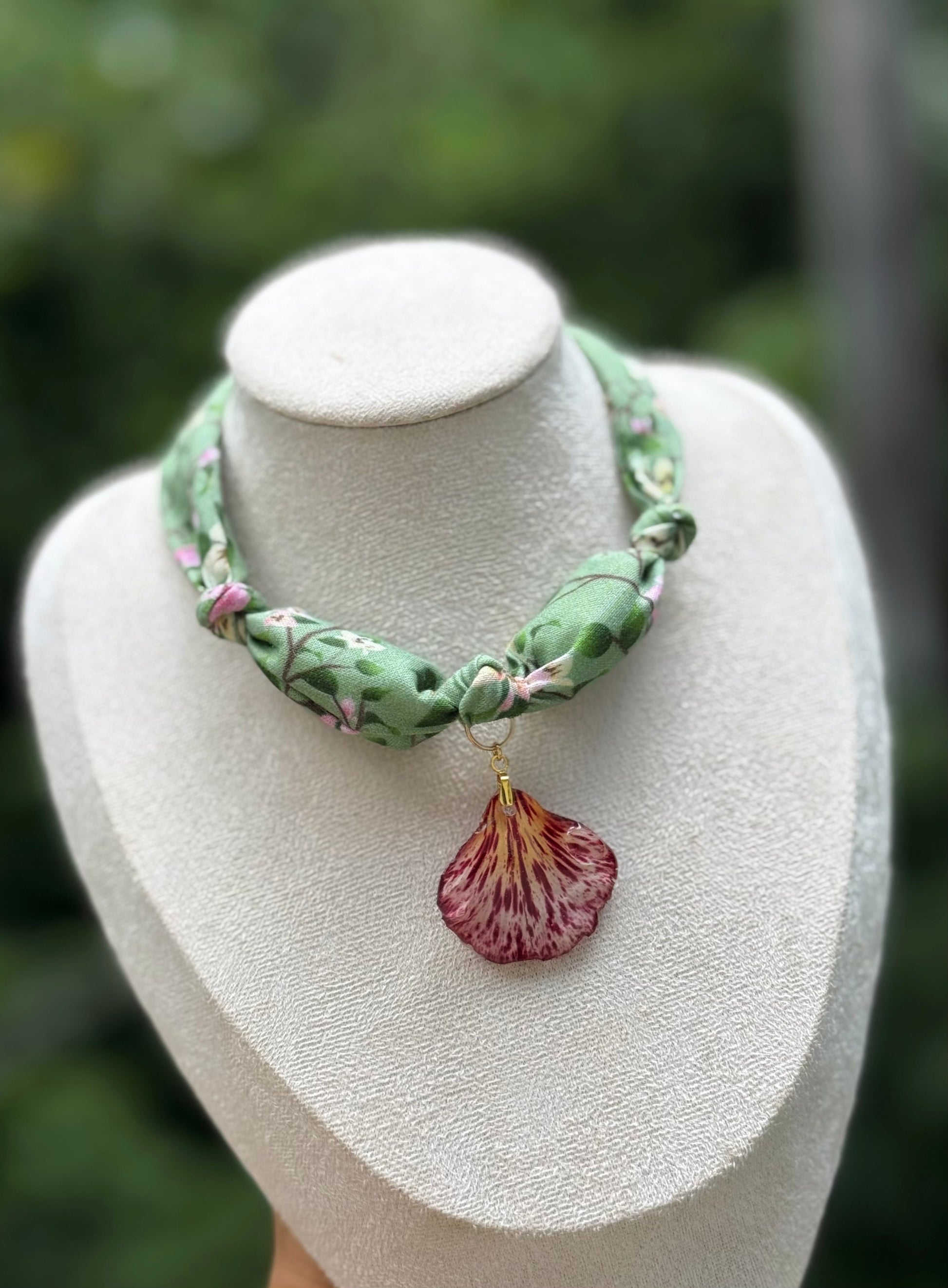 Collar de tela con diseño de trinitarias de puerto rico, dije creado con pétalo real flamboyan de Puerto Rico, charms de acero inoxidable, cierre alambrado a mano