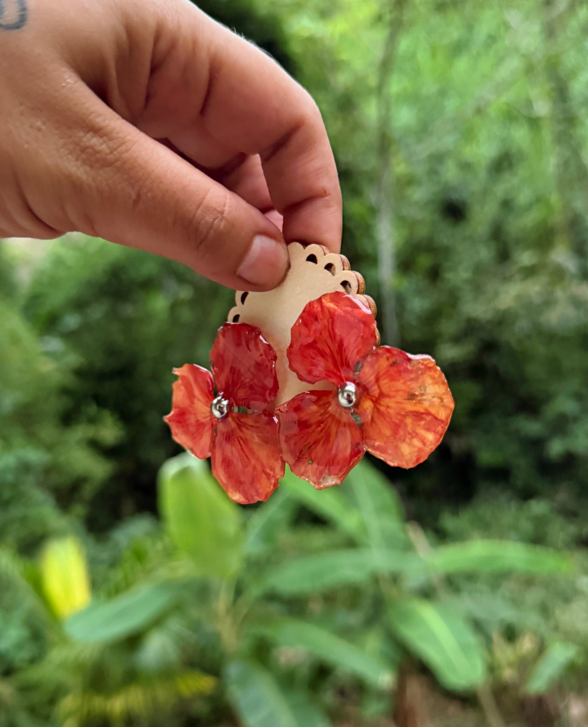 Pantallas artesanales creadas con pétalos reales de flamboyan del pueblo de Isabela Puerto Rico, estas piezas son de aproximadamente 2” pulgadas de ancho por pantallas, livianas con el gancho de atrás en acero inoxidable.
