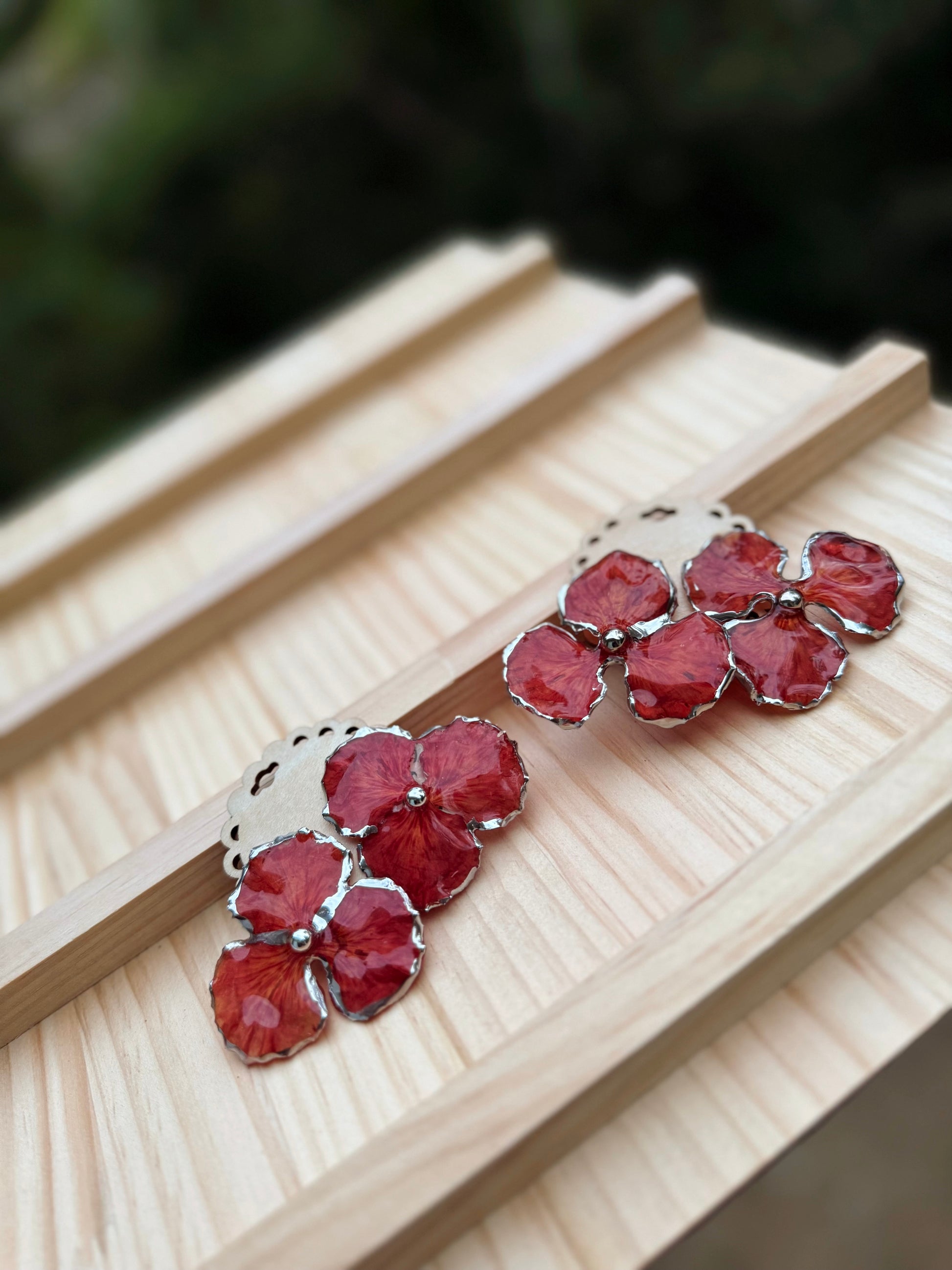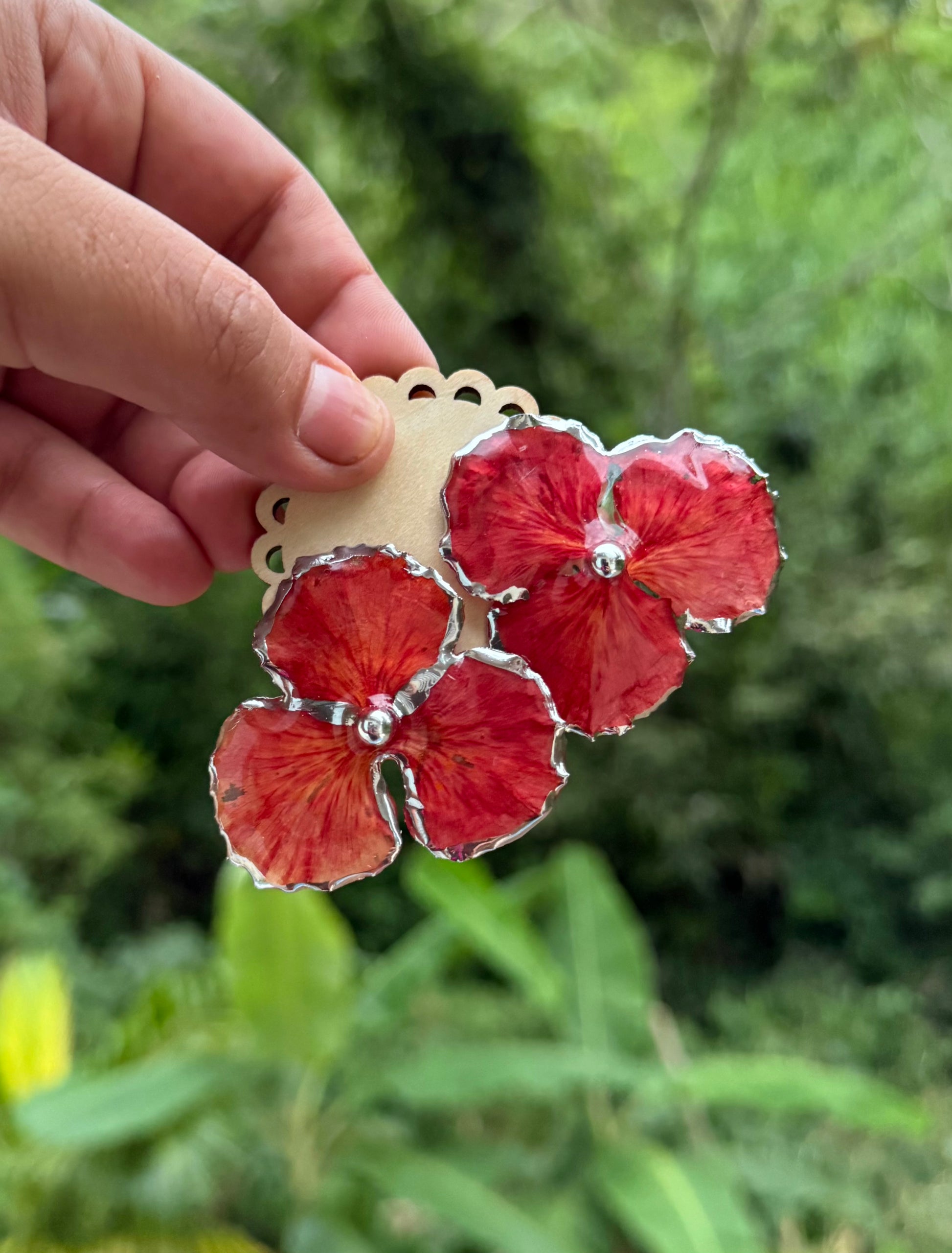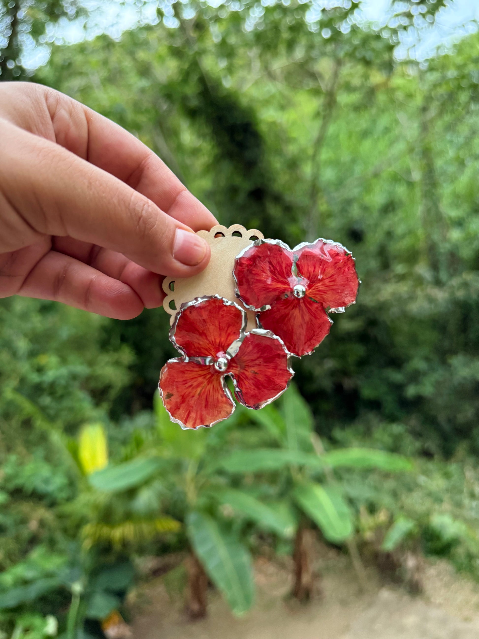 Pantallas artesanales creadas con pétalos reales de flamboyan del pueblo de Isabela Puerto Rico, estas piezas son de aproximadamente 2” pulgadas de ancho por pantallas, livianas con el gancho de atrás en acero inoxidable.