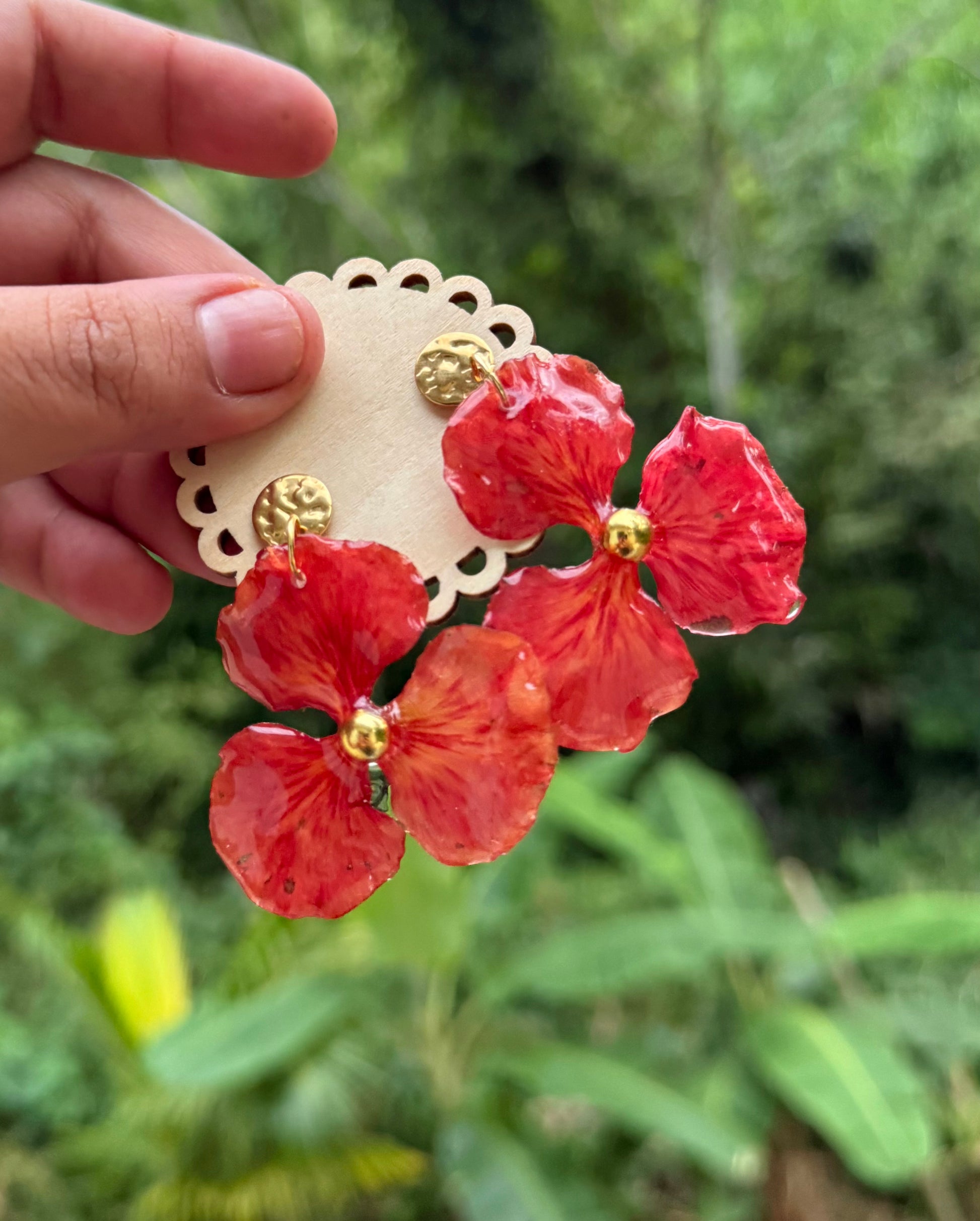 Pantallas artesanales creadas con pétalos reales de flamboyan del pueblo de Isabela Puerto Rico, estas piezas son de aproximadamente 2” pulgadas de ancho por pantallas, livianas con el gancho de atrás en acero inoxidable.
