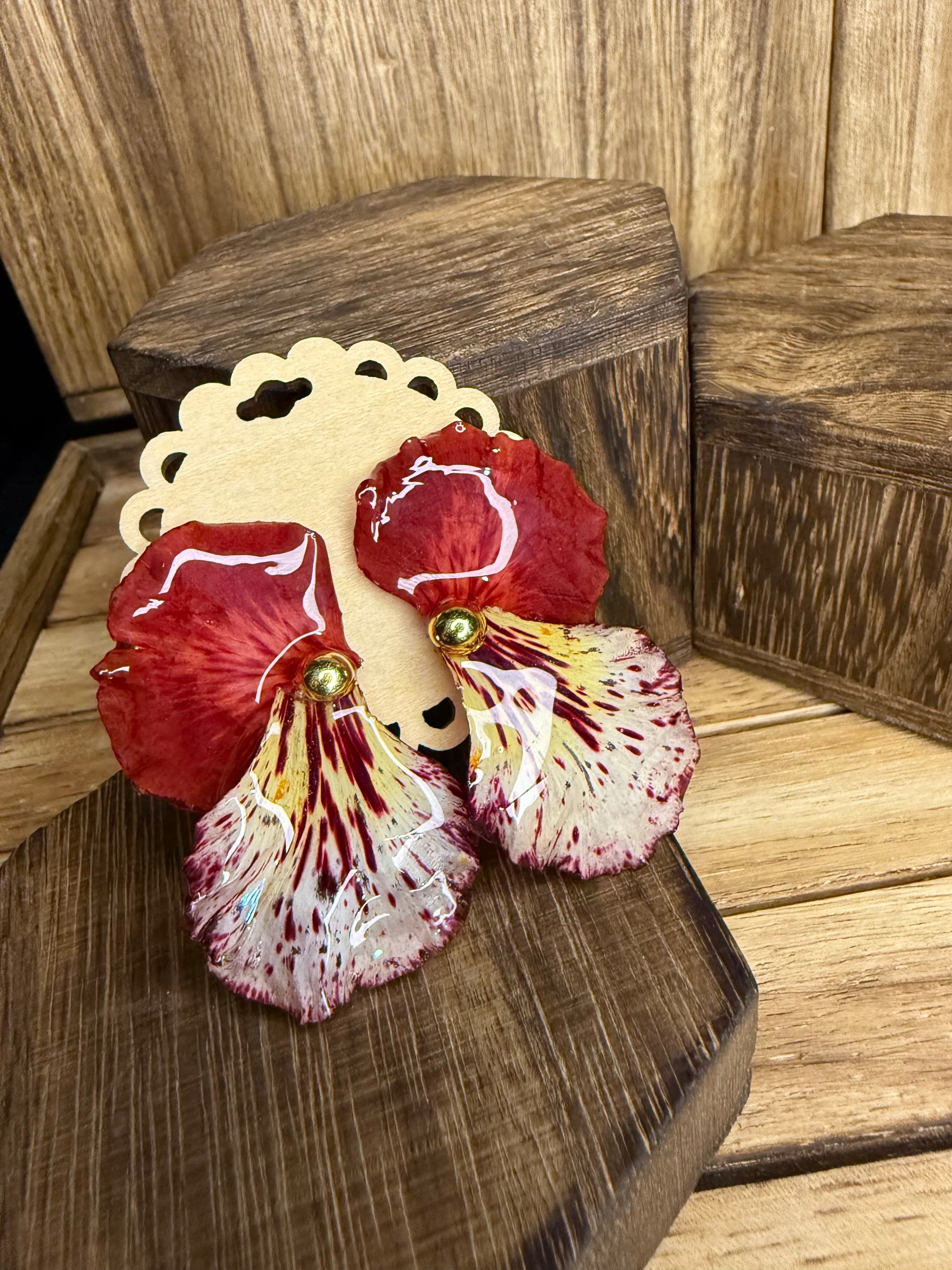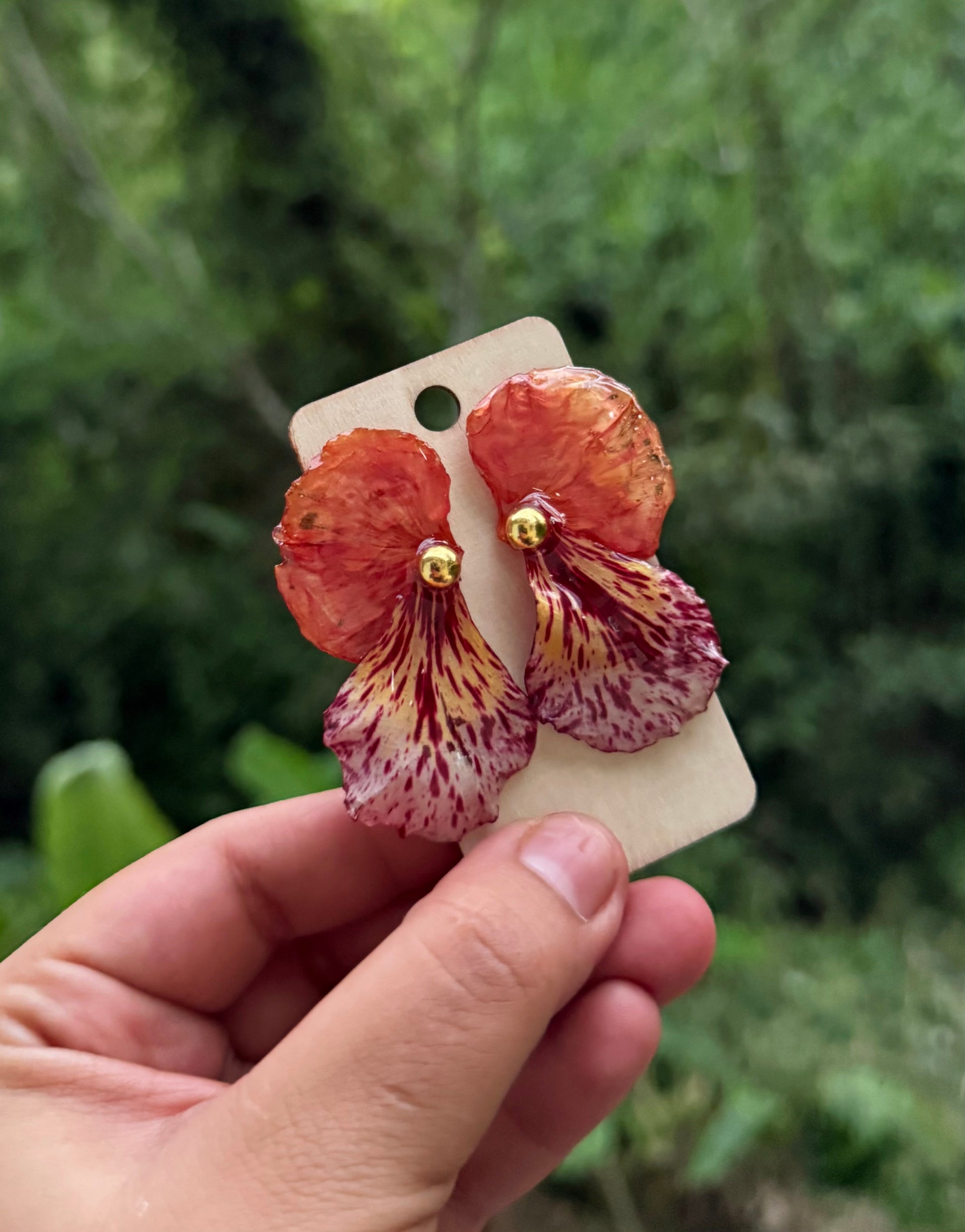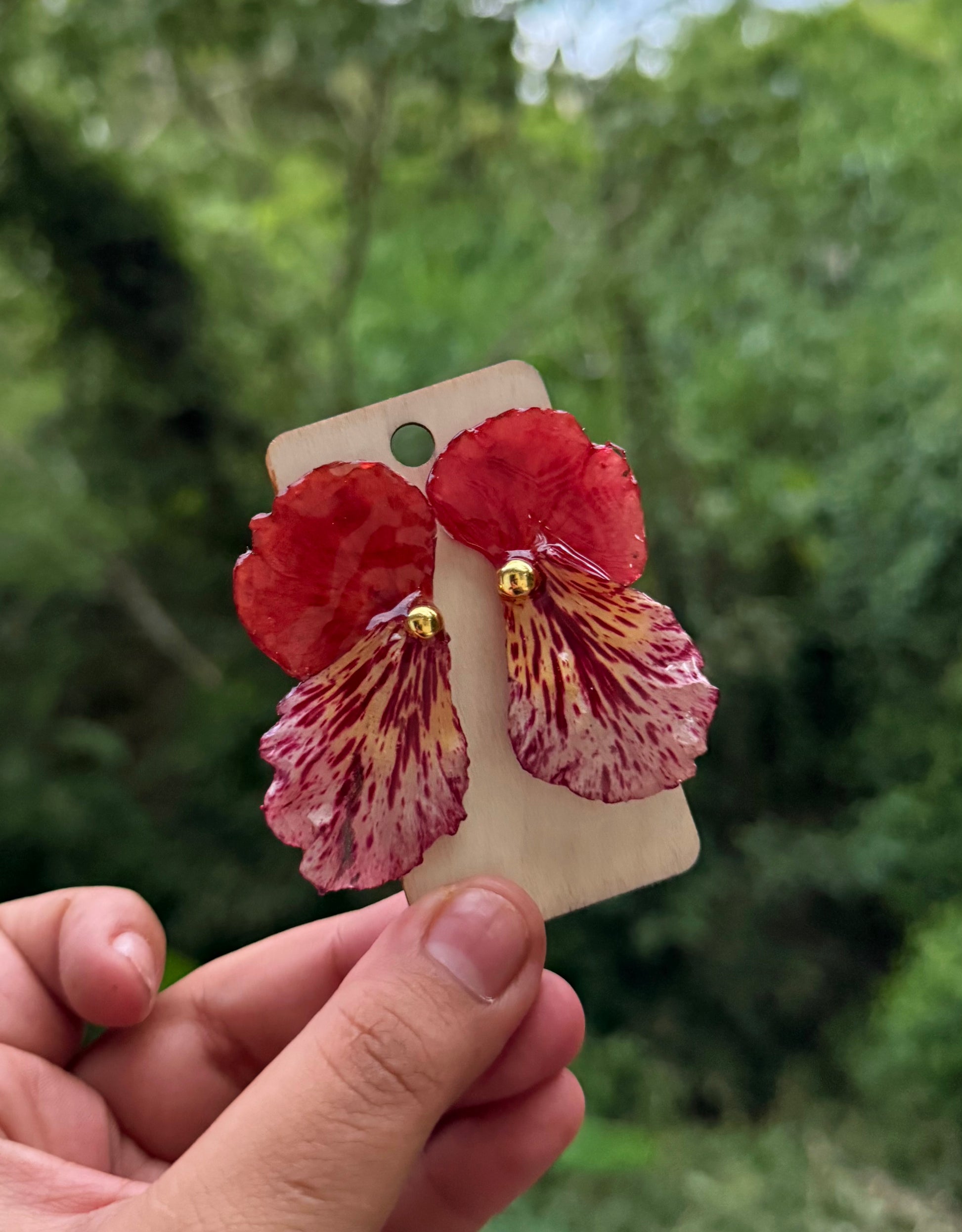 Pantallas artesanales creadas con pétalos reales de flamboyan del pueblo de Isabela Puerto Rico, estas piezas son de aproximadamente 2” pulgadas de ancho por pantallas, livianas con el gancho de atrás en acero inoxidable.
