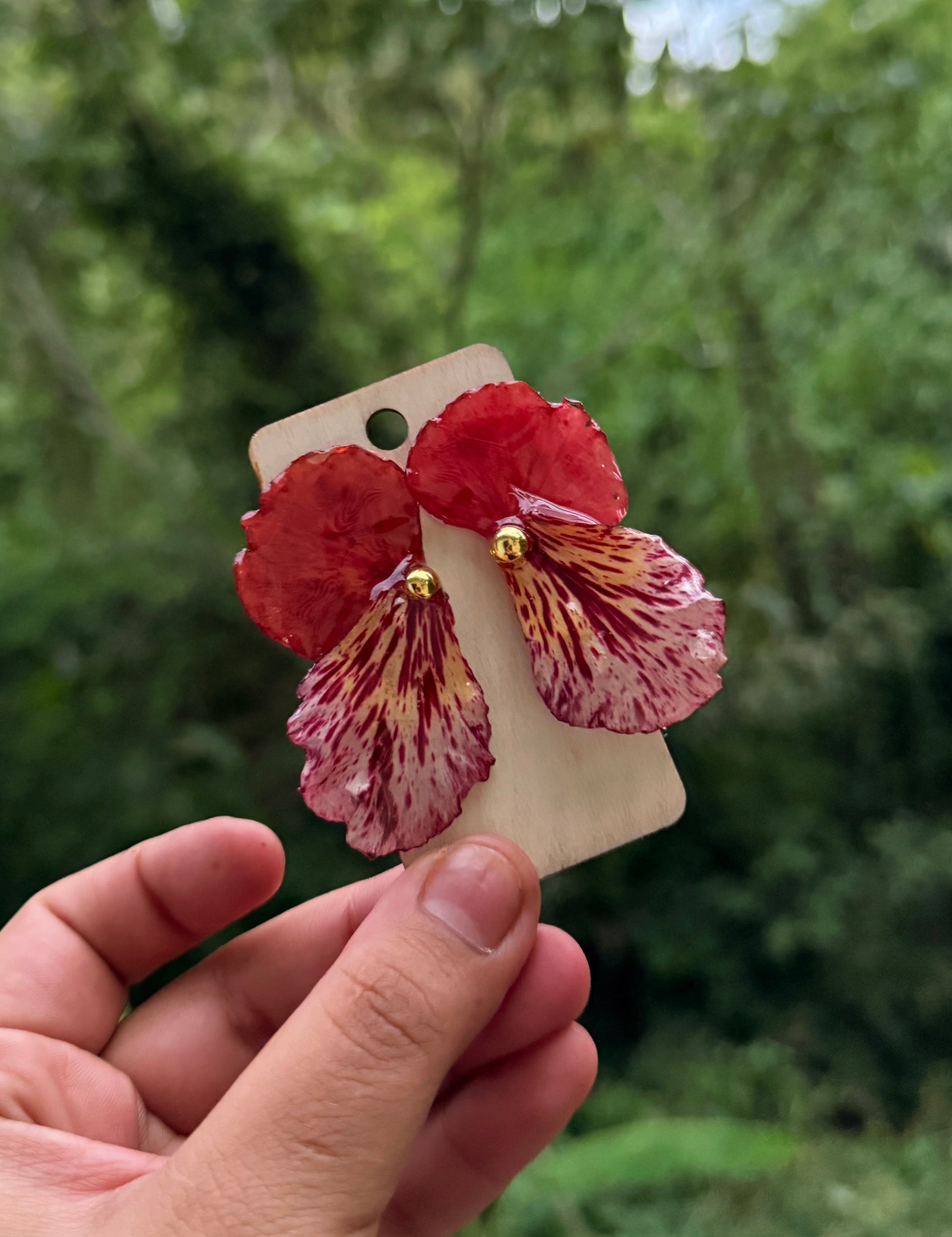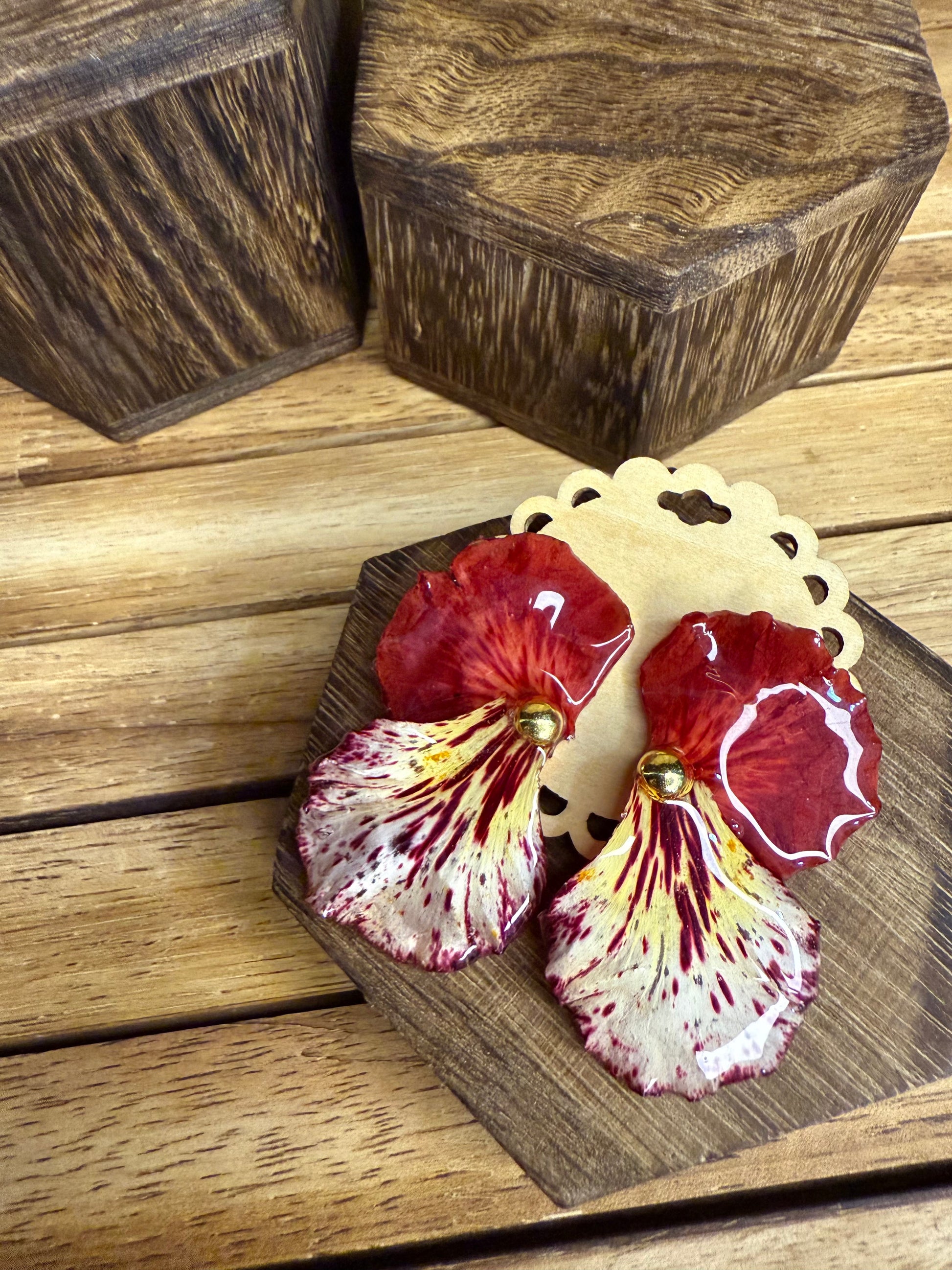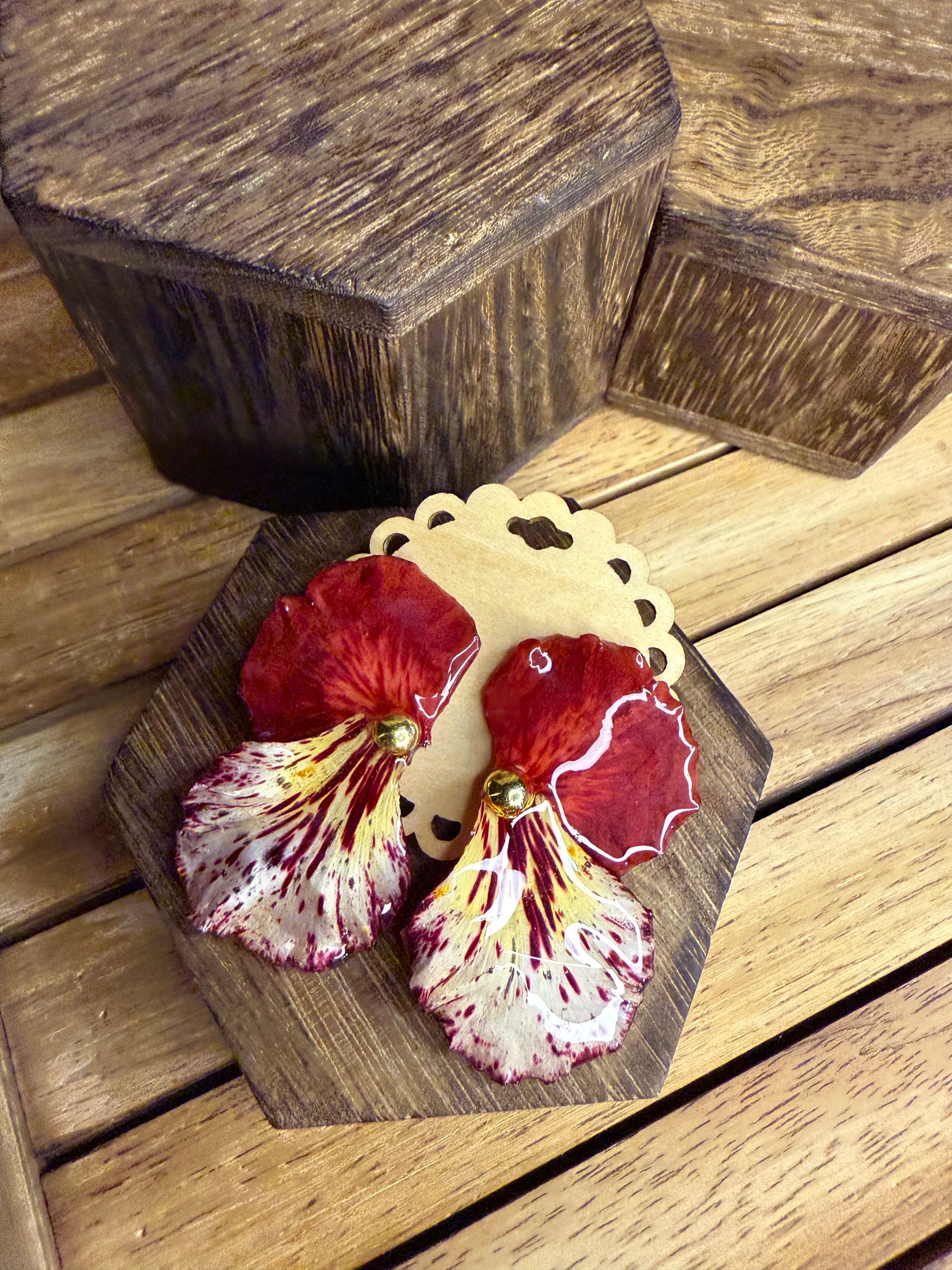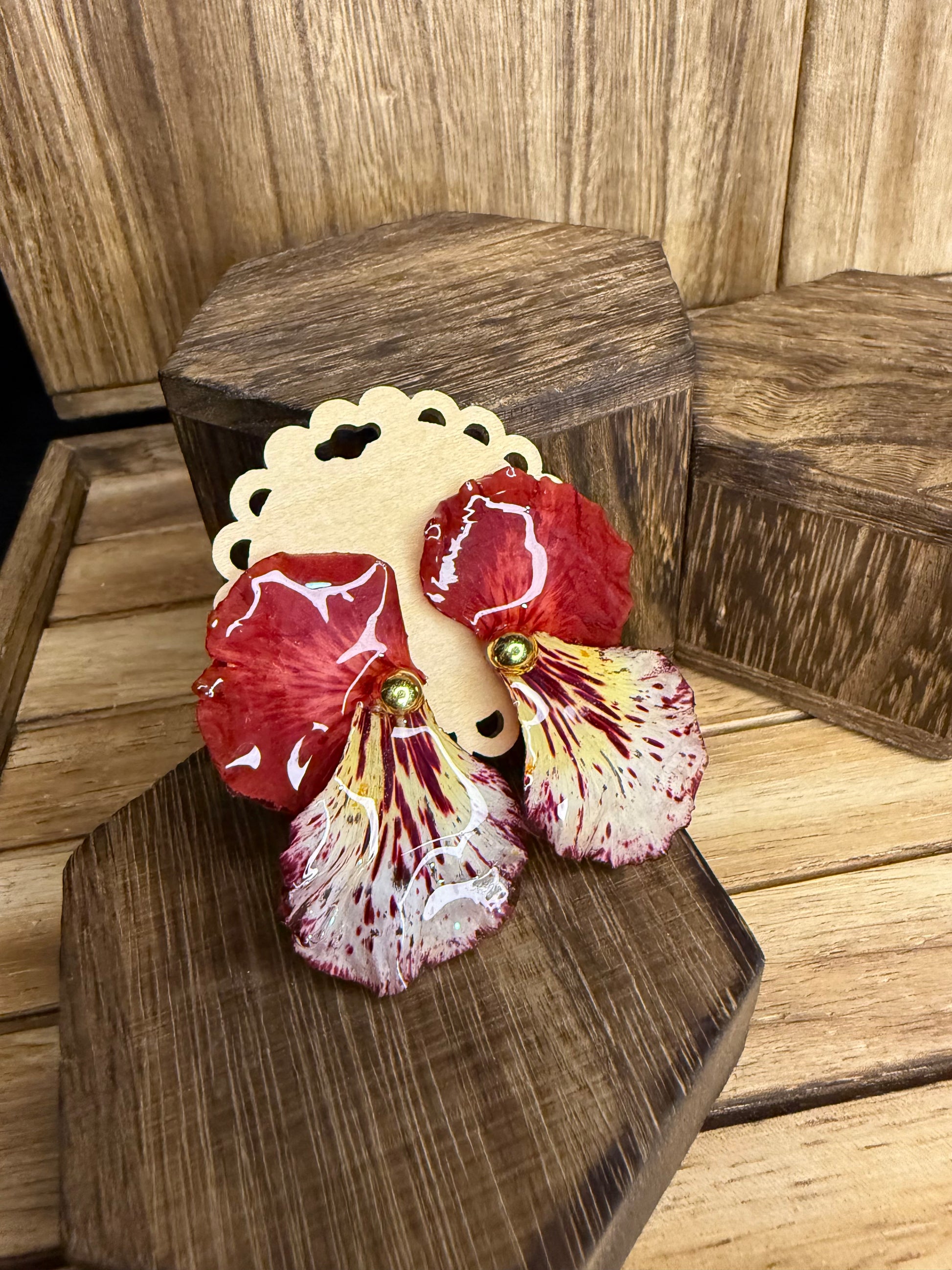 Pantallas artesanales creadas con pétalos reales de flamboyan del pueblo de Isabela Puerto Rico, estas piezas son de aproximadamente 2” pulgadas de ancho por pantallas, livianas con el gancho de atrás en acero inoxidable.