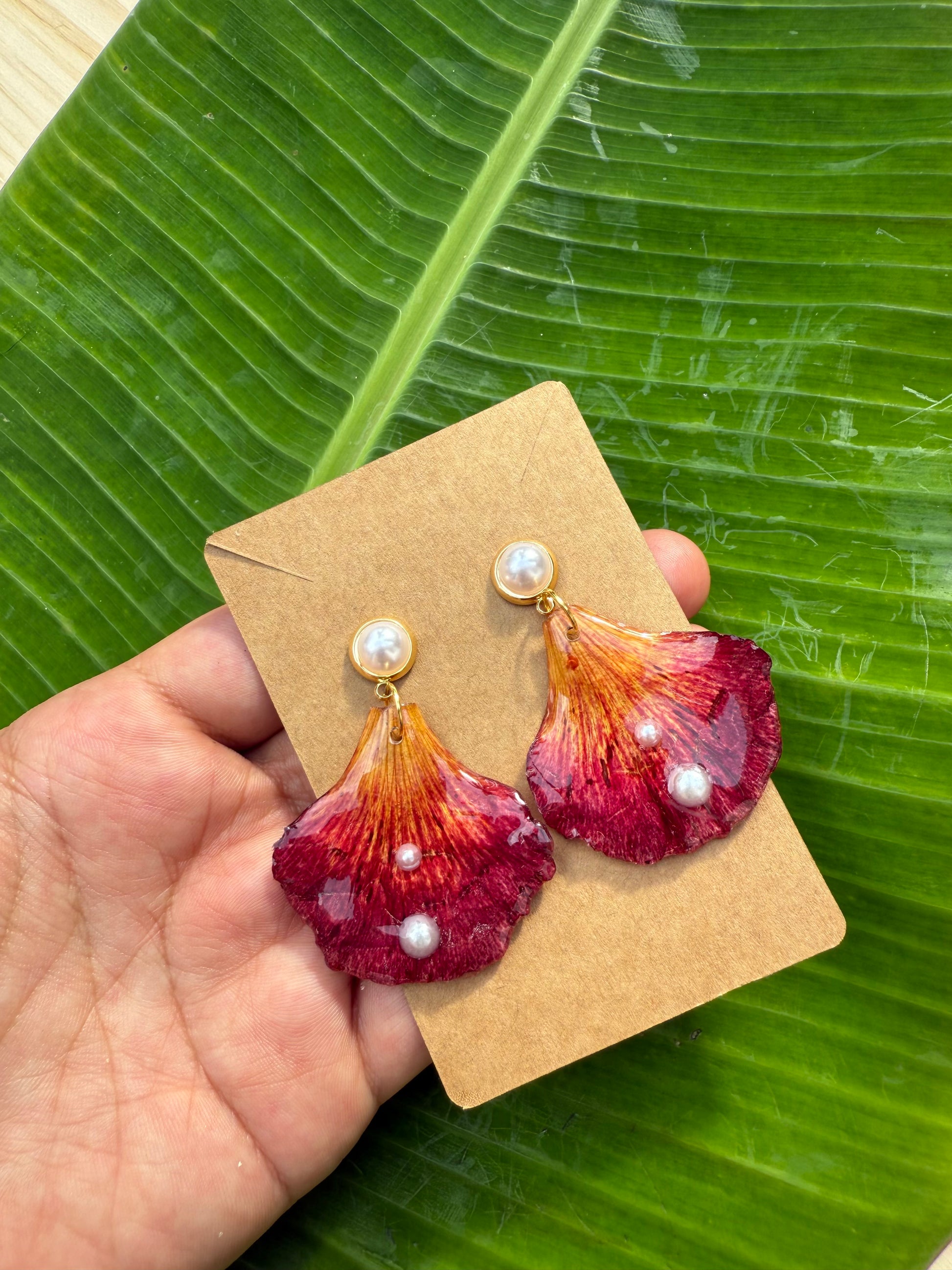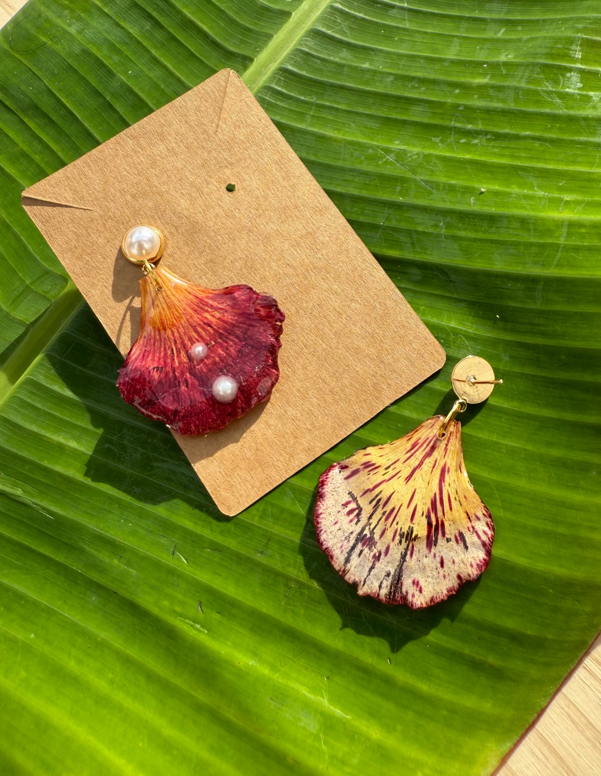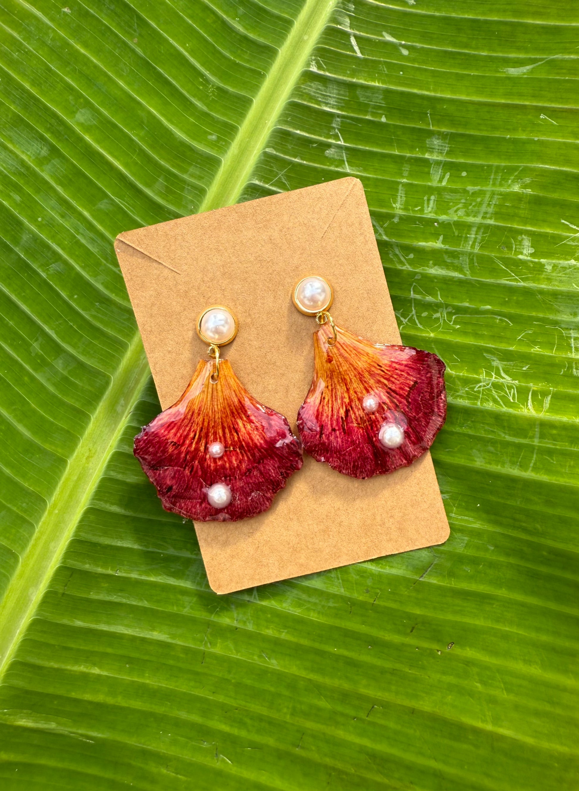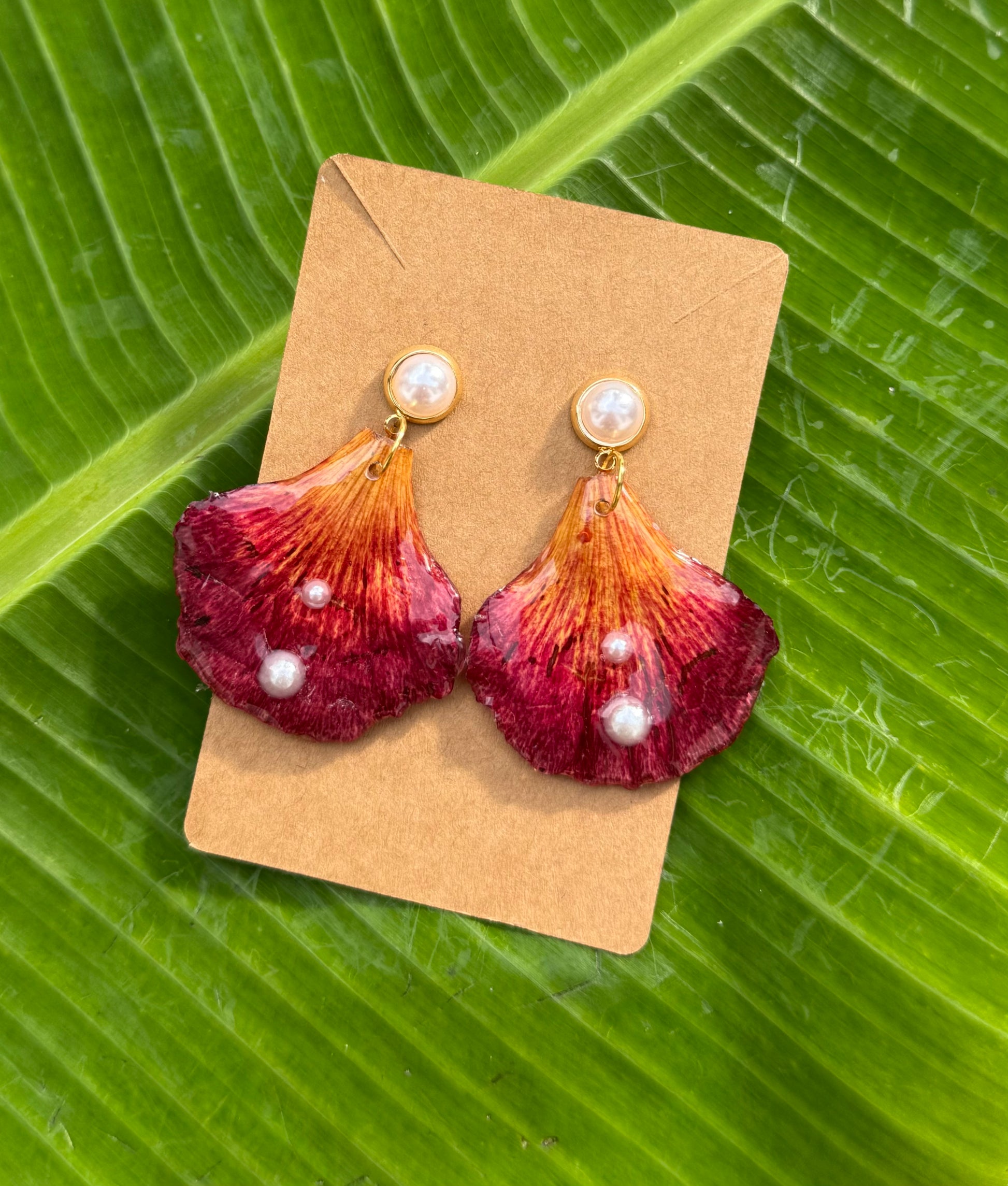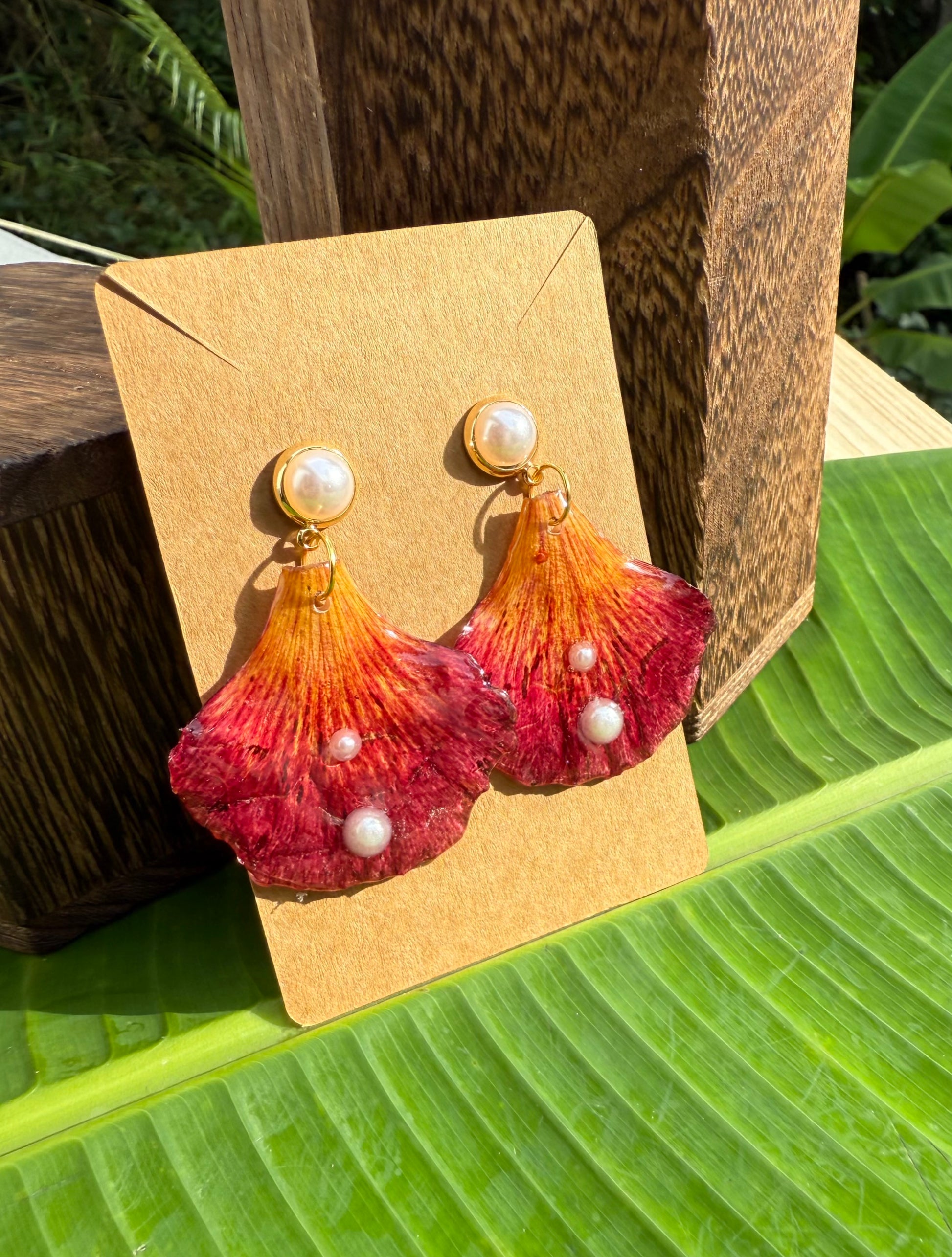 Pantallas artesanales creadas con pétalos reales de Flamboyan de Isabela Puerto Rico, charm de acero inoxidable con detalles perlados.