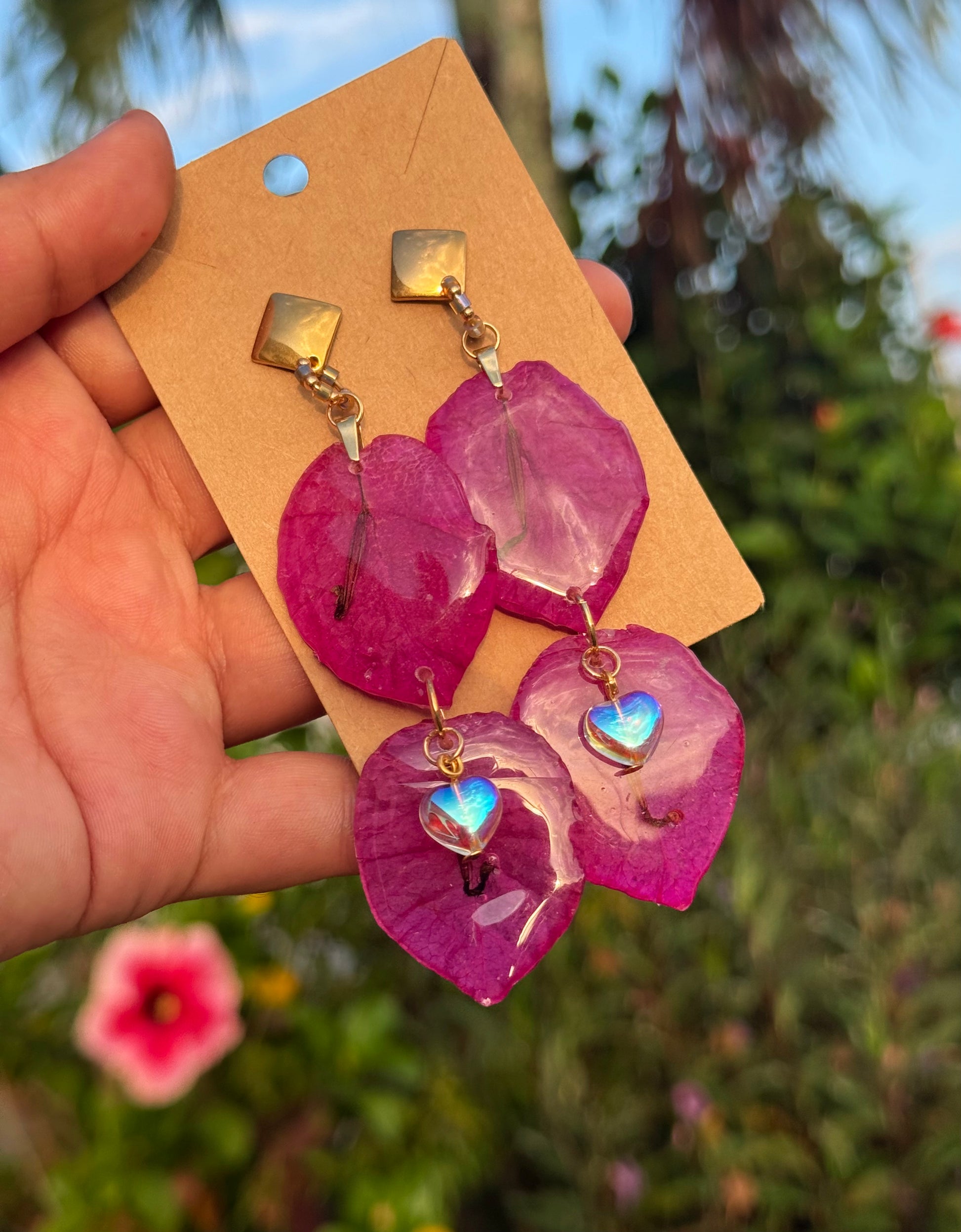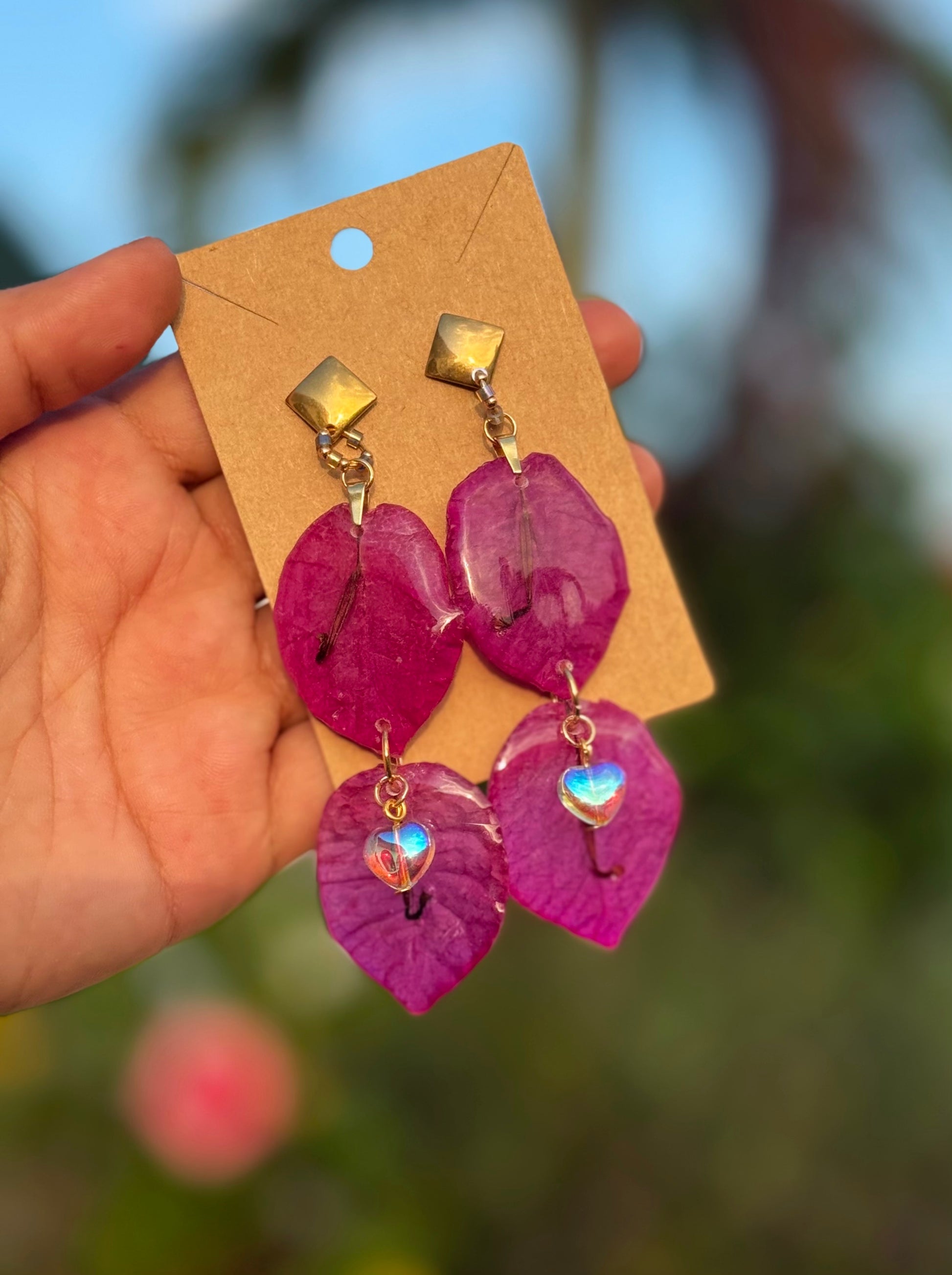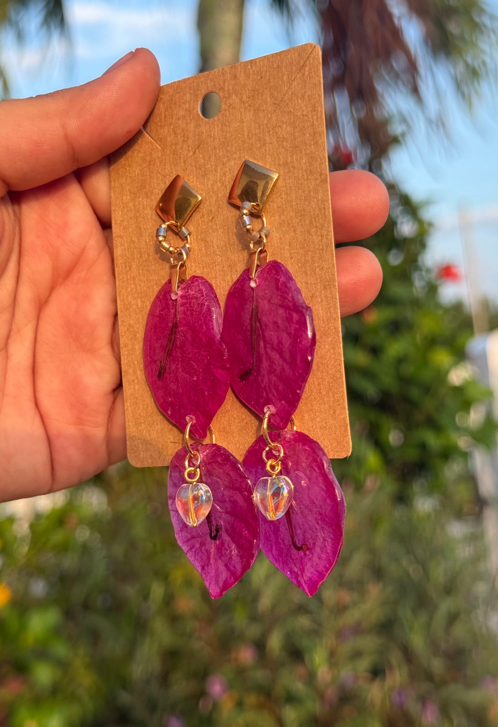 Pantallas realizadas con pétalos reales del faro punta de higüeras de Rincón Puerto Rico, cristales con efecto aurora borealis alambrados a mano, aros con mostacillas y bead en enchape de oro 14k.