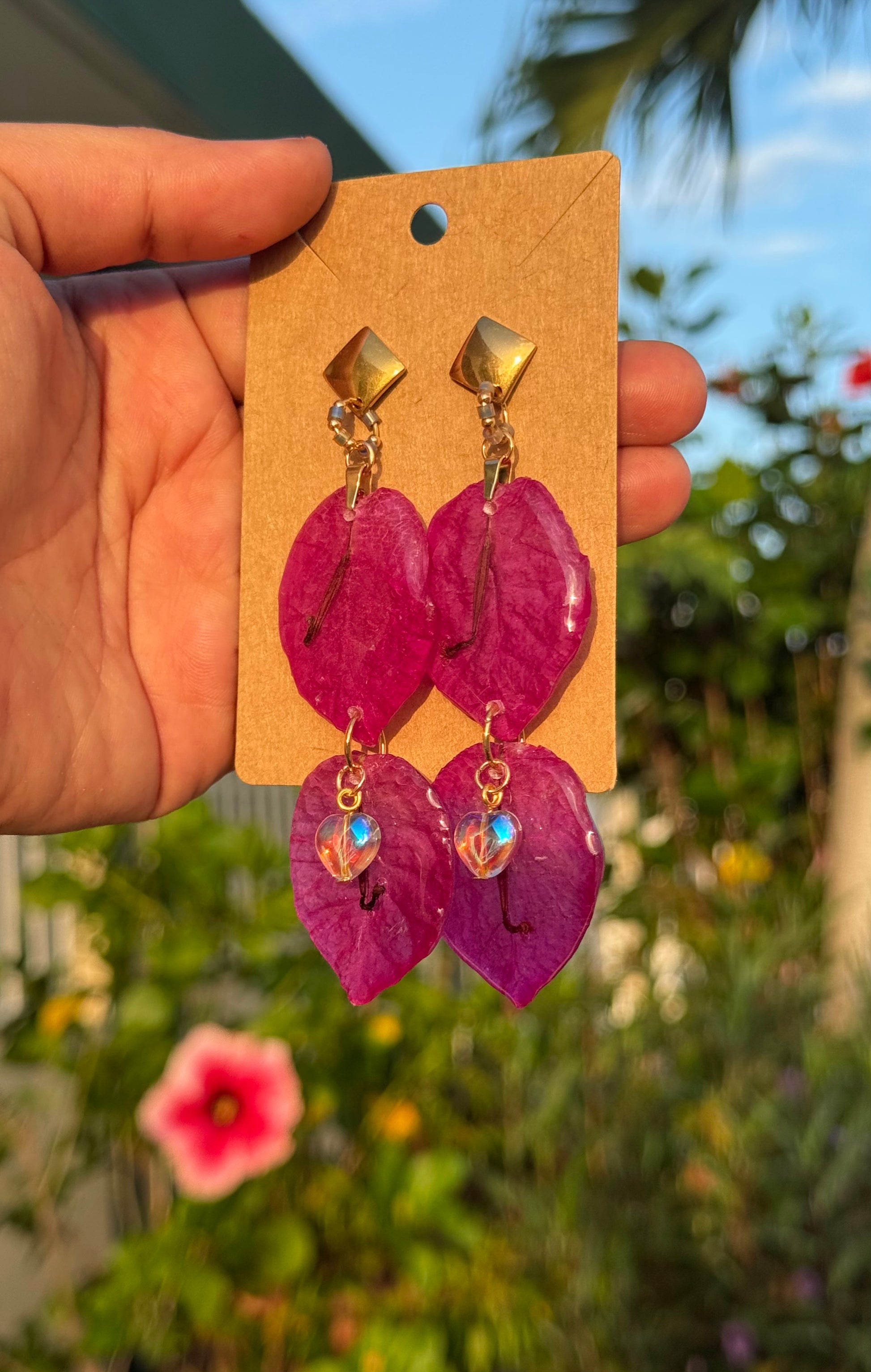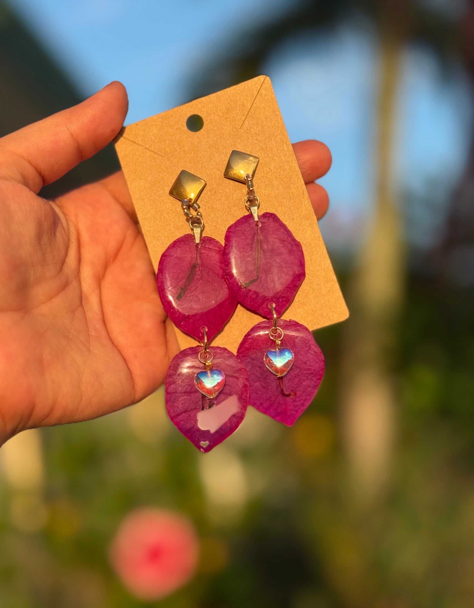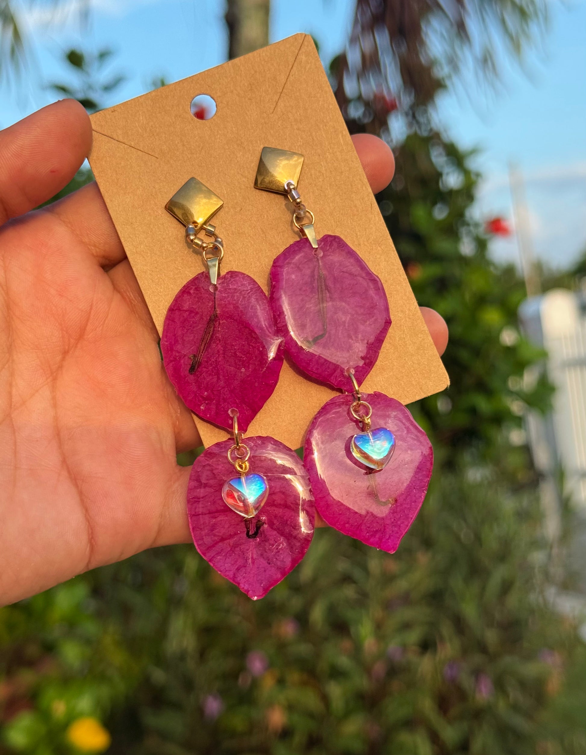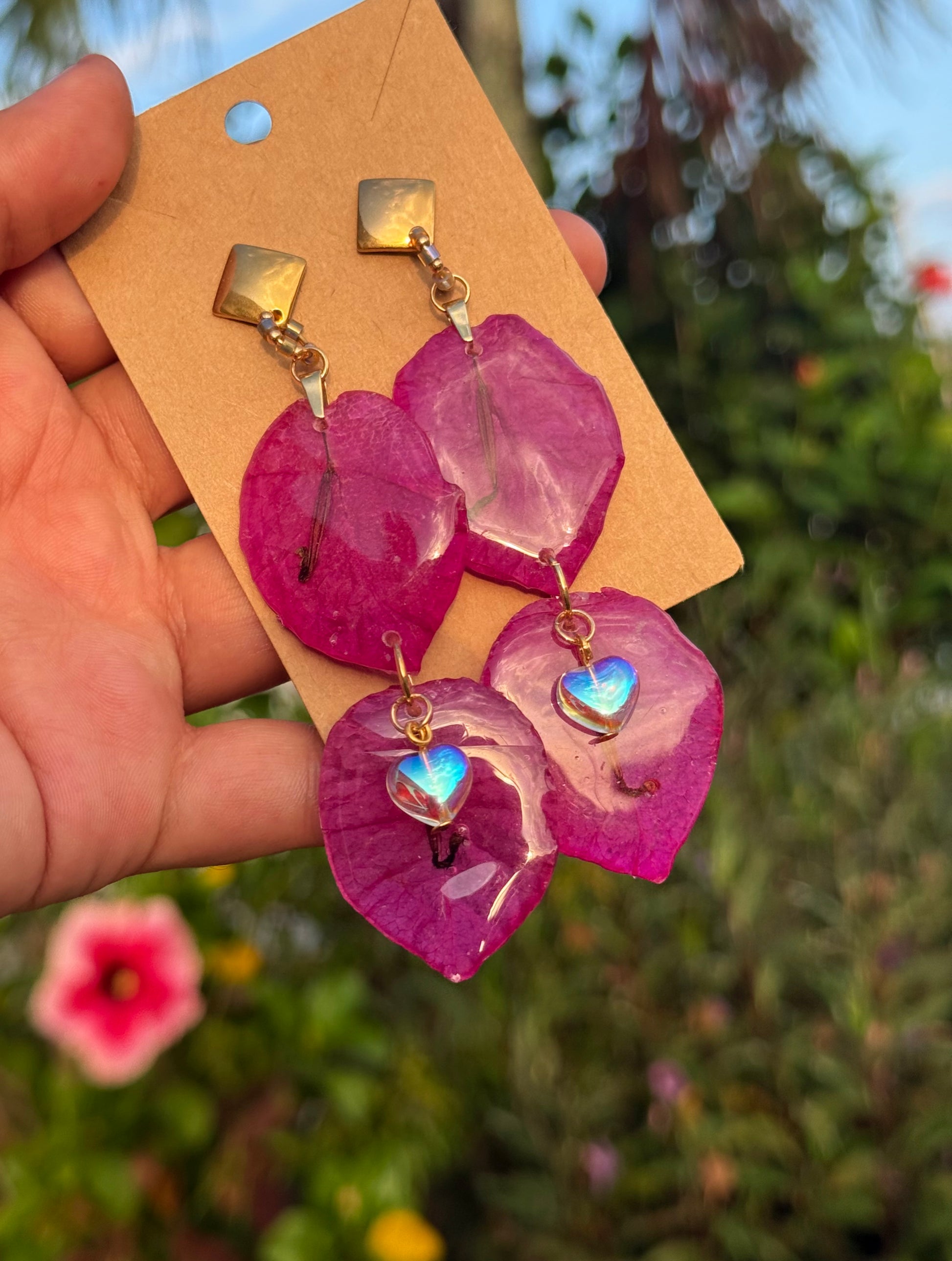Pantallas realizadas con pétalos reales del faro punta de higüeras de Rincón Puerto Rico, cristales con efecto aurora borealis alambrados a mano, aros con mostacillas y bead en enchape de oro 14k.